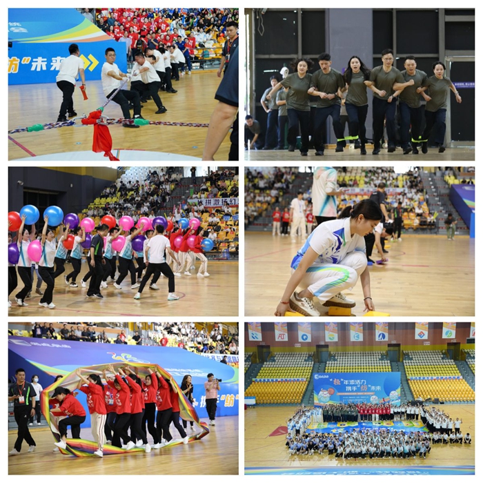 在隨后進行的趣味運動賽中,各支隊伍盡展所能,賽出屬于輕紡人的青春風(fēng)采。激烈的“力拔山河”多向拔河比賽,各隊隊員緊握繩索,腳跟扎地,在齊聲吶喊中爆發(fā)出驚人的力量,場面緊張而激烈;歡快的“齊頭并進”項目中,參賽選手綁腿搭肩同行,口中喊著整齊的口號,步伐協(xié)調(diào)地向著終點沖刺,如同親密無間的戰(zhàn)友;巧妙的“凝心聚力”背夾球環(huán)節(jié)中,隊員們背靠背,心連心,夾著氣球快速又小心地前進,氣球的每一次微晃都牽動著全場觀眾的心;充滿挑戰(zhàn)的“共度難關(guān)”接力賽中,參賽隊伍爭分奪秒、心心相連、共度難關(guān),巨大的“車輪”憑借團隊協(xié)作的力量在賽道上飛速滾動,仿佛破浪前行的巨輪,朝著勝利的彼岸全速前進。趣味運動賽的最后,各參賽隊伍代表共同拼出匯聚著全體參賽企業(yè)圖形徽標的大拼圖并合影,象征著全體輕紡人團結(jié)一心、共同奮斗的堅定信念。經(jīng)過激烈而又充滿趣味的比拼,輕紡設(shè)計院最終獲得了趣味運動賽團體第一名,金皇環(huán)保和海峽融合分獲第二、第三名。