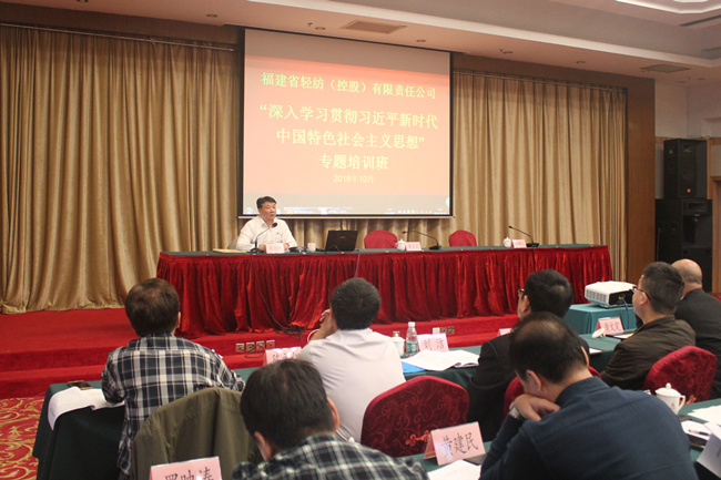 10月22日,福建輕紡在閩江飯店舉辦“學習貫徹習近平新時代中國特色社會主義思想”專題培訓班,福建輕紡黨組書記、總經理黃文定,黨組成員、副總經理陳國樑,黨組成員、紀檢組組長潘士穎,控股公司本部全體中層干部、權屬企業(yè)領導班子成員及全體紀檢監(jiān)察人員共計80余人參加培訓。省國資委黨委委員、省紀委駐省國資委紀檢組組長黃共和應邀為福建輕紡干部上了一堂題為“學習貫徹習近平新時代中國特色社會主義思想 堅定不移推進國有企業(yè)全面從嚴治黨”的黨課。