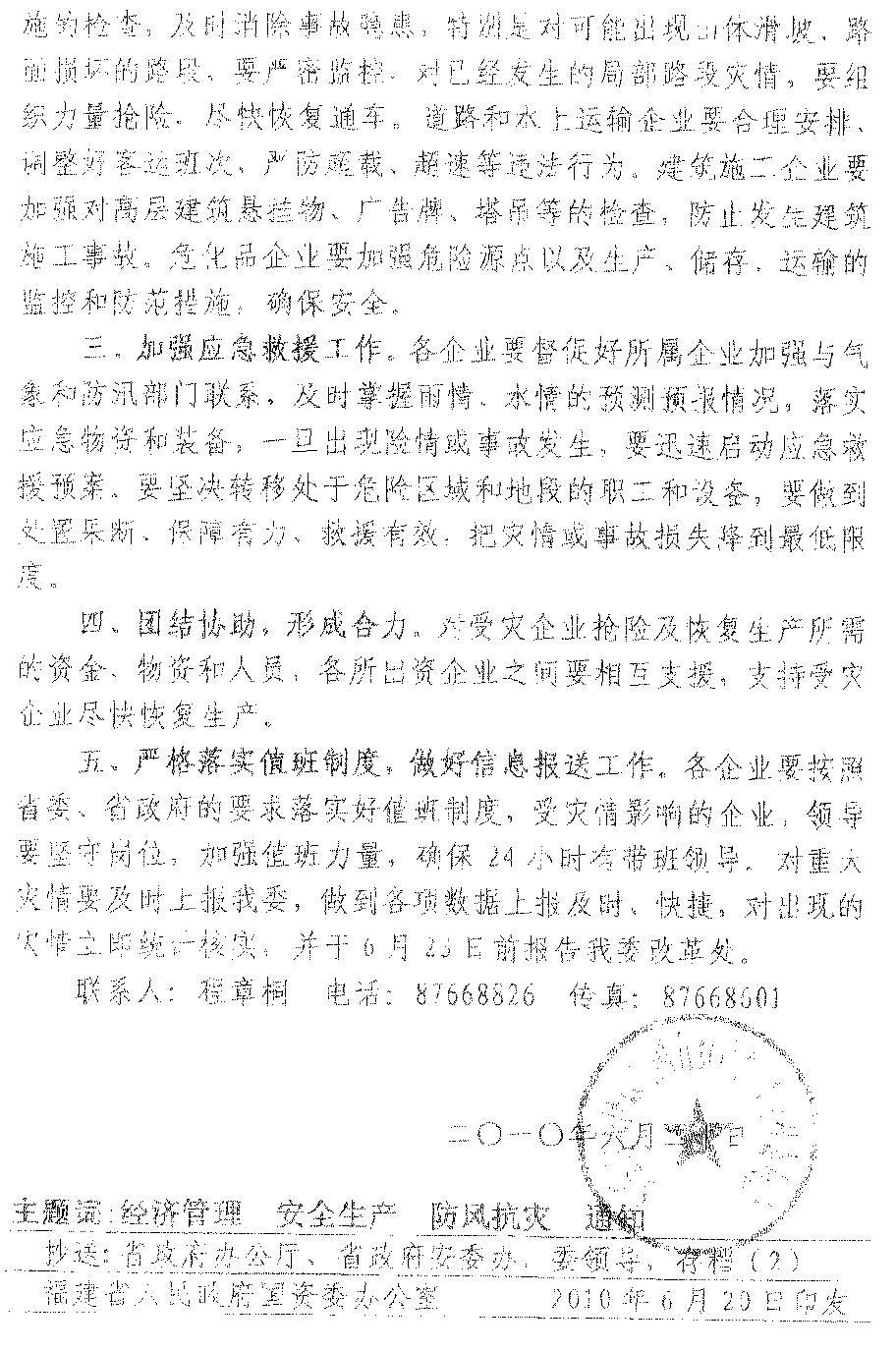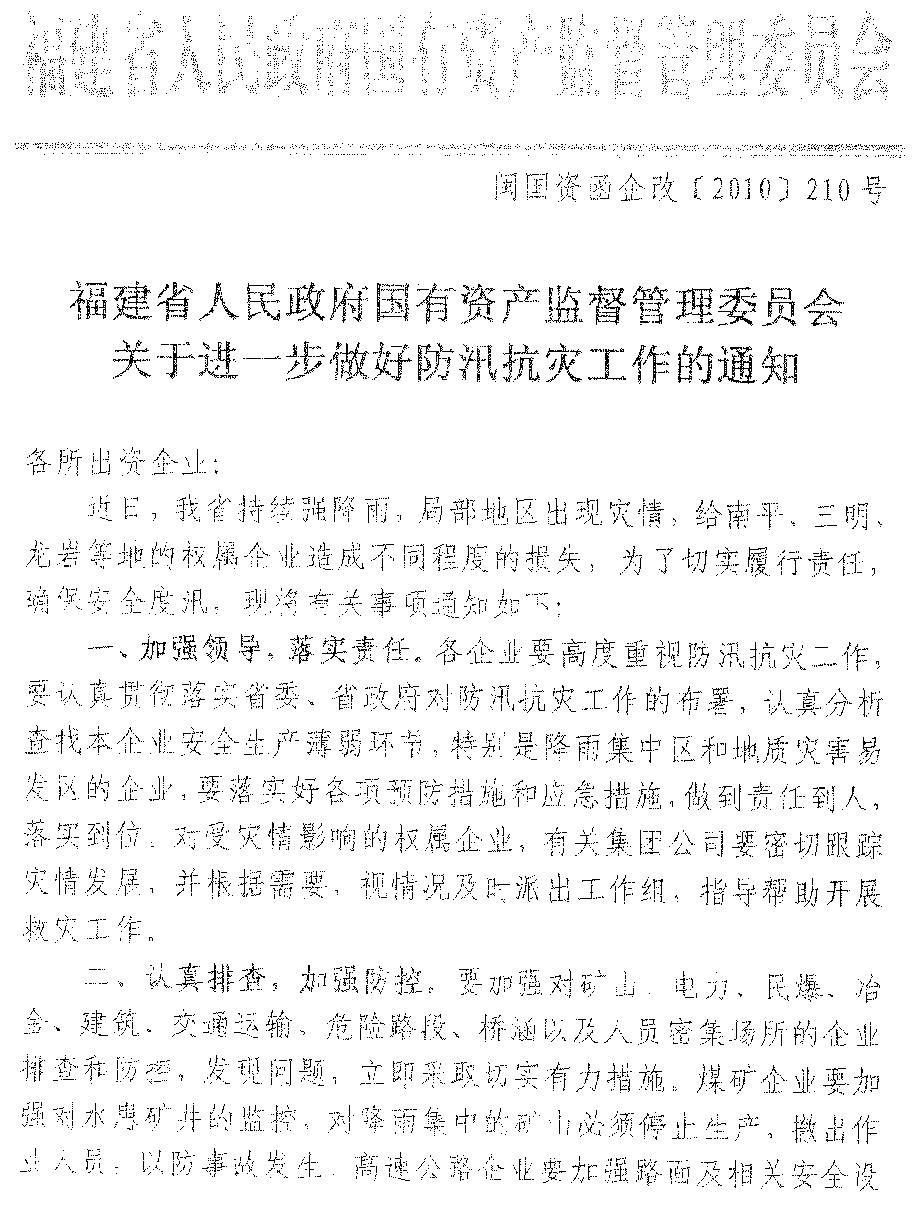 現(xiàn)將《福建省人民政府國(guó)有資產(chǎn)監(jiān)督管理委員會(huì)關(guān)于進(jìn)一步做好防汛抗災(zāi)工作的通知》(閩國(guó)資函企改〔2010〕210號(hào))轉(zhuǎn)發(fā)給你們。結(jié)合我司企業(yè)實(shí)際,提出如下要求,一并貫徹落實(shí)。