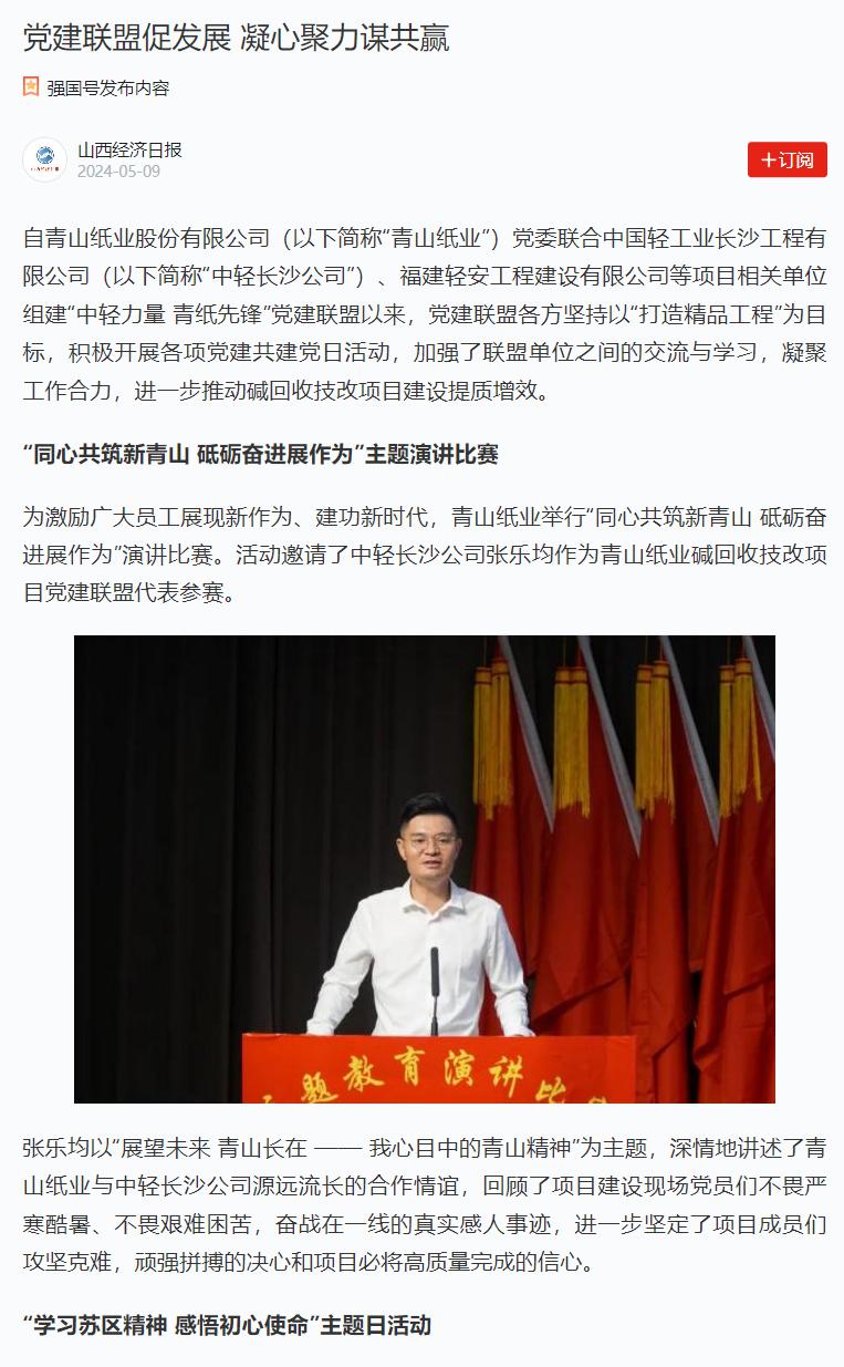 2024年5月9日,福建省青山紙業(yè)股份有限公司與中國輕工業(yè)長沙工程有限公司“中輕力量 青紙先鋒”黨建聯(lián)盟成果榮登“學(xué)習(xí)強國”!學(xué)習(xí)強國-強國號發(fā)布題為《黨建聯(lián)盟促發(fā)展 凝心聚力謀共贏》文章,對黨建聯(lián)盟特色做法與成效給予了充分肯定。依托“學(xué)習(xí)強國”強大的影響力和號召力,青山紙業(yè)將推動黨建賦能國企高質(zhì)量發(fā)展行動再上新臺階。